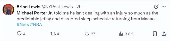 北京时间10月18日,NBA季前赛,篮网114-119惜败猛龙。这场比赛篮网队的核心小迈克尔-波特打出了加盟篮网以来的最佳一战,他全场比赛斩获34分10篮板3助攻6记三分球。